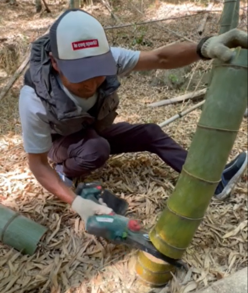 竹工房で竹細工に使用する竹は、許可を頂いている竹藪に入って、社員と共に自分たちで必要な分だけ伐採させていただいております。