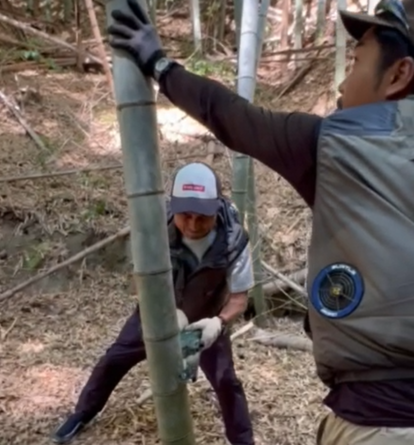 竹工房で竹細工に使用する竹は、許可を頂いている竹藪に入って、社員と共に自分たちで必要な分だけ伐採させていただいております。